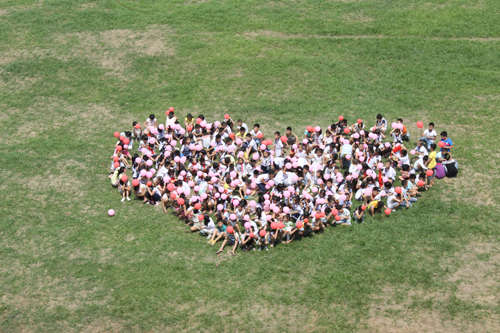 同學們手持紅色氣球,在操場上擺出心形圖案