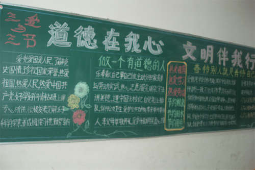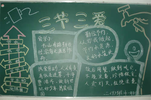 活動中,各班根據(jù)自己班級的特點,充分發(fā)揮學生的主動性,積極行動,精心設計出一塊塊主題鮮明、布局合理、形式多樣、融知識性、教育性于一體、內容豐富的黑板報。學生以自己獨特的方式表達了對“三愛三節(jié)”的理解,讓所有同學明白“三愛三節(jié)”的真實含義。學校評委從黑板報的標題、字體、圖案、文字內容、整體效果等項目進行了評比,評出了一、二、三等獎。