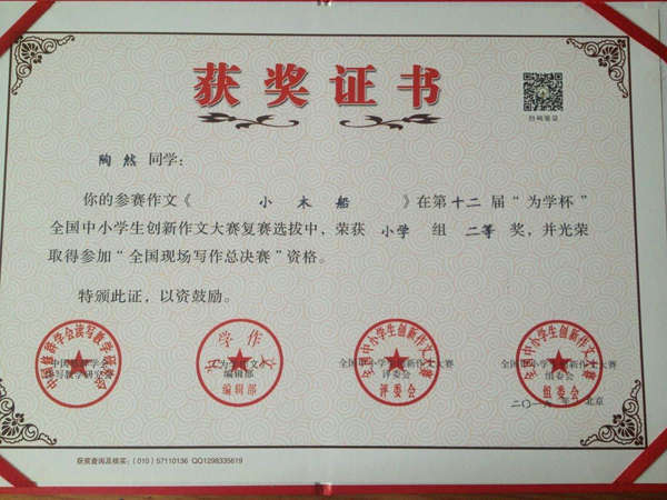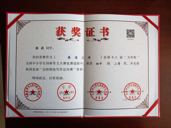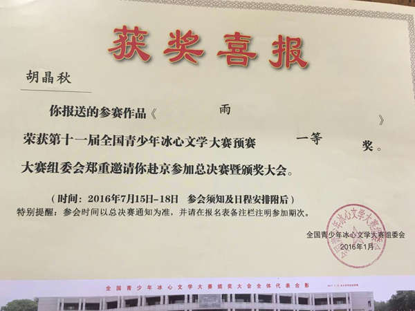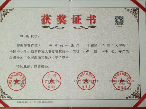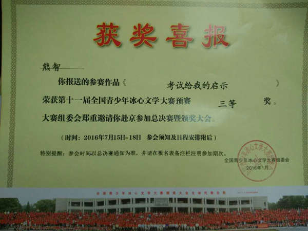 在第十一屆全國青少年冰心文學大賽和第十二屆“為學杯”全國中小學創新作文大賽中,英邁培訓學校碩果累累。其中在第十一屆全國青少年冰心文學大賽中,占正旺、胡晶秋兩位同學榮獲預賽一等獎,吳雨澤同學榮獲預賽二等獎,熊智、陶然兩位同學榮獲預賽三等獎。在第十二屆“為學杯”全國中小學創新作文大賽中,鄒旸同學榮獲小學組一等獎,陶然同學榮獲小學組二等獎,張莉同學榮獲初中組三等獎。同時,學校的曹小芹老師在第十一屆全國青少年冰心文學大賽中,榮獲輔導一等獎。