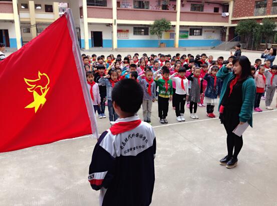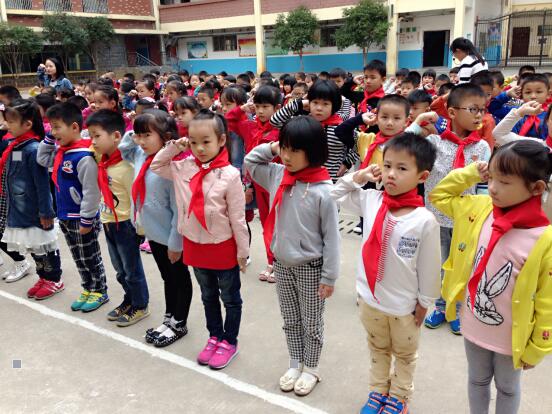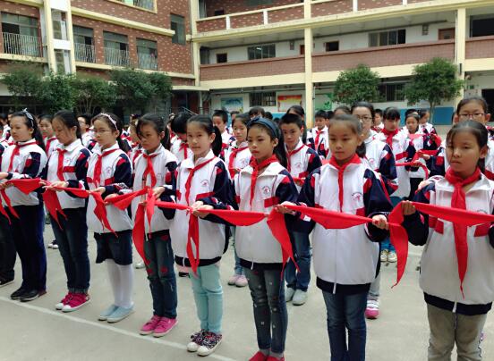 “我們是共產主義接班人,繼承革命先輩的光榮傳統,愛祖國,愛人民,鮮艷的紅領巾飄揚在前胸……”伴隨著嘹亮的中國少年先鋒隊隊歌,學校大隊輔導員謝珊珊老師宣讀了新隊員名單,六年級少先隊員向新隊員敬隊禮,為新隊員佩戴了鮮艷的紅領巾。至此,120名小學生被批準加入中國少年先鋒隊組織,正式成為光榮的中國少年先鋒隊隊員了。儀式上,大隊輔導員倡導全體少先隊員要熱愛學習、講究文明、孝順父母、尊敬師長,為自己胸前的紅領巾增光添彩,要用自己的行動證明自己無愧于少先隊員這個神圣的稱號。新隊員在隊旗下莊嚴宣誓、呼號——“為共產主義事業而奮斗,時刻準備著!”