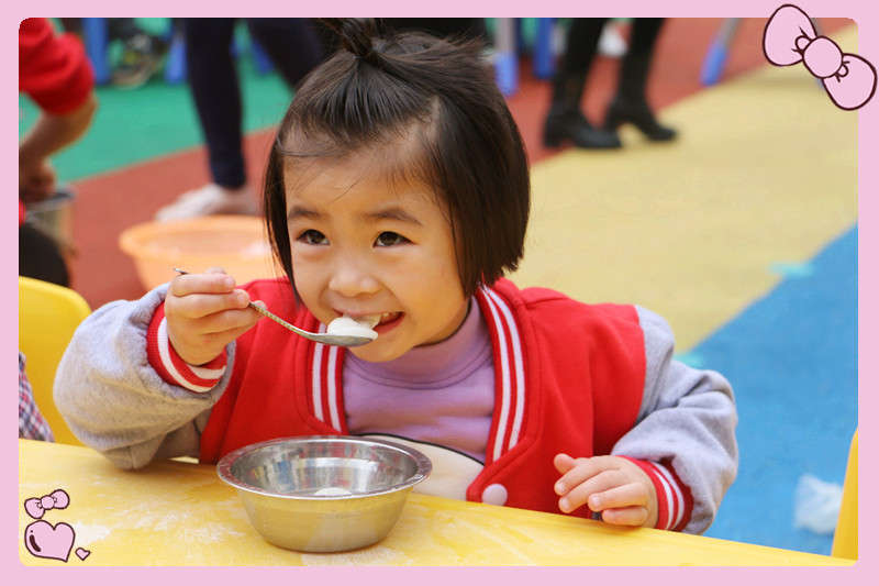 最后一個(gè)活動(dòng)是家長和孩子一起包湯圓,大手包小手,小手包著圓圓的湯圓,每個(gè)人的臉上都洋溢著幸福的笑容。運(yùn)動(dòng)了一上午后,吃著自己包的湯圓,也是格外的甜,不知不覺比平時(shí)多吃了一些呢。