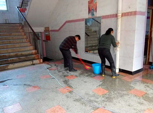 在這次衛生大掃除活動之前,學校楊校長對各責任區的衛生包干區工作進行了具體分工。上午8:10,雖然天氣陰沉沉下著雨,但大家的積極性一點未受影響,都按時來到會議室就此次活動聽取安排,各小組負責人接受任務后帶領各組成員就忙碌開了,有的拿掃帚、有的拿刷子、有的拿抹布對教學樓過道、樓梯、扶手,門窗等進行洗刷,尤其是衛生間進行了徹底的打掃,在打掃過程中,大家積極配合,不怕臟、不怕累,干得熱火朝天,雖然衣服濕了、鞋子濕了,但沒有一個人抱怨,目的只有一個,讓學生有一個安心、舒適的學習氛圍,讓老師有一個好的教學環境,讓校園環境有一個新的變化。經過大家2個多小時的共同努力,整個教學樓、綜合樓變的凈了,空氣也變清新了。