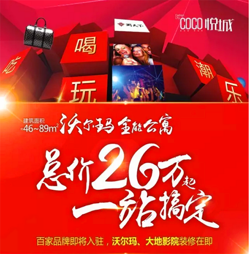 象湖沃爾瑪-COCO悅城位于金沙二路和象湖路交匯處,項(xiàng)目總建筑面積約15 萬方,購物中心項(xiàng)目定位于時(shí)尚、品位、家庭、體驗(yàn)購物中心,集大型超市、國際影院、大型情景室內(nèi)特色餐飲街、兒童教育親子體驗(yàn)娛樂和大型室內(nèi)情景潮流生活館為一體,通過打造昌南“時(shí)尚地標(biāo)”、 “吃喝玩樂聚集地”、“全品牌系列生活館”、“休閑娛樂首選地”,樹立高品質(zhì)城市時(shí)尚生活新標(biāo)志。總價(jià)26萬起全能公寓,吃喝玩樂購全能共享家!百家品牌即將入駐,沃爾瑪裝修在即。