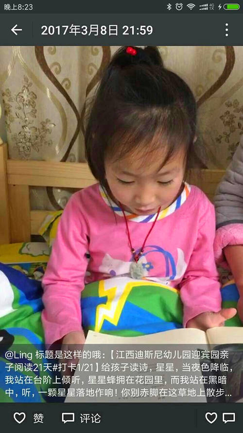 考慮到不同年齡段孩子的不同發(fā)展需求,幼兒園還細(xì)致周到的分別為小、中、大班的孩子選定了不同的打卡主題。大班為親子閱讀,中班為我是家庭好幫手,小班為好習(xí)慣培養(yǎng)。