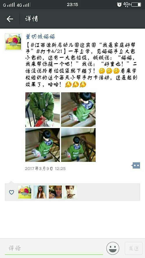 活動(dòng)一推出,立即獲得了家長們的支持,家長們紛紛積極參與,將與孩子的互動(dòng)記錄在朋友圈,并發(fā)在班級(jí)群內(nèi)與家長們共同交流。此外,幼兒園還為家長們準(zhǔn)備了獎(jiǎng)狀,既感謝家長們對(duì)幼兒園工作的支持,也感謝家長們?yōu)楹⒆映砷L的付出。