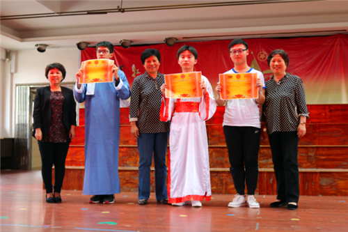 朗誦比賽采取每個班級演出完后即刻打分,現場評比,七(8)班的《中華少年》和八(5)班的《短歌行》獲得一等獎,七(7)班的《祖國啊,我親愛的祖國》和八(6)班的《我有一個強大的祖國》獲得二等獎,七(4)班的《我驕傲,我是中國人》和八(1)班的《為有犧牲多壯志》獲得三等獎,學校領導上臺為獲獎班級頒發了獎狀。最后,學校副校長王桂紅作了總結講話,宣布朗誦比賽圓滿結束。