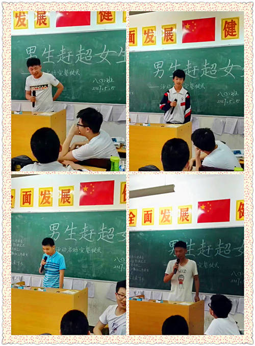 4點45分,胡老師走進教室,在黑板上瀟灑地寫下"男生趕超女生" 活動啟動儀式幾個大字。大家都丈二和尚摸不著頭腦,不知道胡老師這葫蘆里賣的是什么藥,為什么要開展這次活動呢?別急,你看,胡老師一轉身,用響亮的聲音說道:“ 同學們,這段時間里。我發現,班上女同學學習積極性特別高,經常向老師請教問題,學習態度非常好。但男生,相對而言,學習態度不夠認真。所以這次班會我們舉行“男生趕超女生” 活動啟動宣誓儀式,讓男同學們說說自己的趕超目標。” 我們這才恍然大悟。