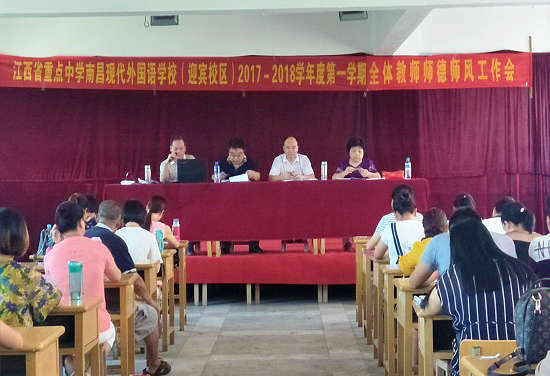 即臨開學,為加強師德師風建設,更好地安排好新學期工作,南昌現代外國語學校(迎賓校區)于2017年8月28日上午召開了全校教工大會暨全體教師師德師風培訓會。會議由鄧華校長主持。