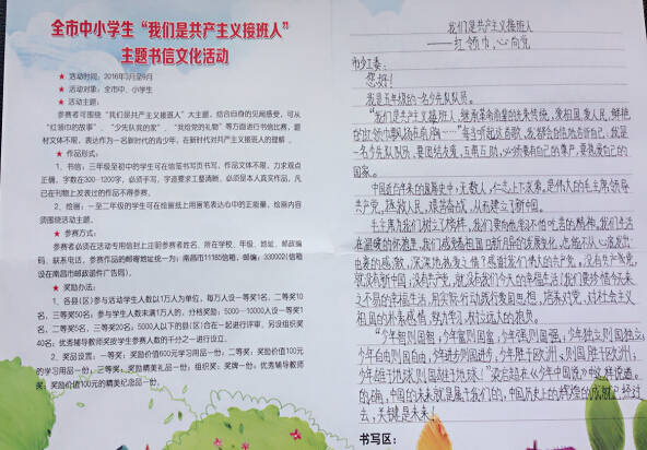 為深入貫徹團(tuán)市委、市教育局、市學(xué)聯(lián)、市少工委《關(guān)于在青少年中深入開展“我們是共產(chǎn)主義接班人”主題團(tuán)、隊(duì)宣傳教育活動(dòng)的通知》的文件要求,進(jìn)一步引導(dǎo)廣大共青團(tuán)員、少先隊(duì)員樹立共產(chǎn)主義遠(yuǎn)大理想,堅(jiān)定跟黨走中國(guó)特色社會(huì)主義道路的信念和信心,增強(qiáng)青少年對(duì)黨和社會(huì)主義祖國(guó)的樸素感情,近日,南昌現(xiàn)代外國(guó)語學(xué)校(象湖校區(qū))積極組織全校學(xué)生開展了以“我們是共產(chǎn)主義接班人”為主題的書信文化活動(dòng)。此次活動(dòng)旨在通過專用郵資信封和信箋作為載體,以傳統(tǒng)書信傳遞真情的形式,深化團(tuán)員和少先隊(duì)員對(duì)實(shí)現(xiàn)遠(yuǎn)大理想要靠廣大青年腳踏實(shí)地奮斗的認(rèn)識(shí)理解,讓青少年認(rèn)識(shí)到共產(chǎn)主義理想的實(shí)現(xiàn)需要一代又一代人的接力奮斗,鼓勵(lì)學(xué)生們不僅僅要做一名好學(xué)生,更要成為一個(gè)有所擔(dān)當(dāng)?shù)墓伯a(chǎn)主義接班人。