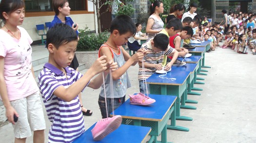 接下來是系鞋帶比賽,當老師下令開始后,有的同學將鞋帶從鞋子的前眼開始穿帶,有的是一根鞋帶穿到底,引起了同學們的陣陣笑聲。原來每天穿鞋帶也有這么多的學問啊,有的參賽的同學囧得是滿臉通紅。