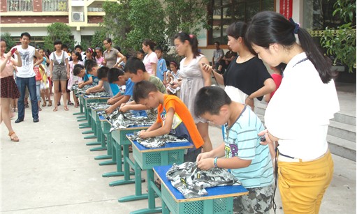 最難的比賽要數縫扣子了,穿針、打結、縫扣,都是細致活,沒有做過的還真是無從下手。從有的小選手們縫扣子熟練的程度來看,肯定是在家曾經做過針線活,有的只有二十幾秒鐘就將扣子釘好,獲得了大家熱烈的掌聲!